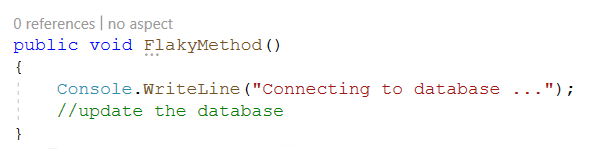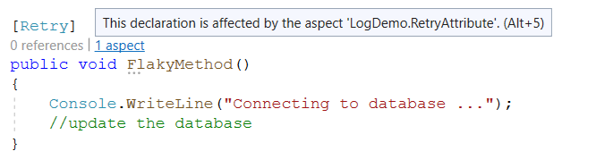 CodeLens now shows that two aspects have been applied to the method FlakyMethod. Click on the text 2 aspects to view the details provided by CodeLens: