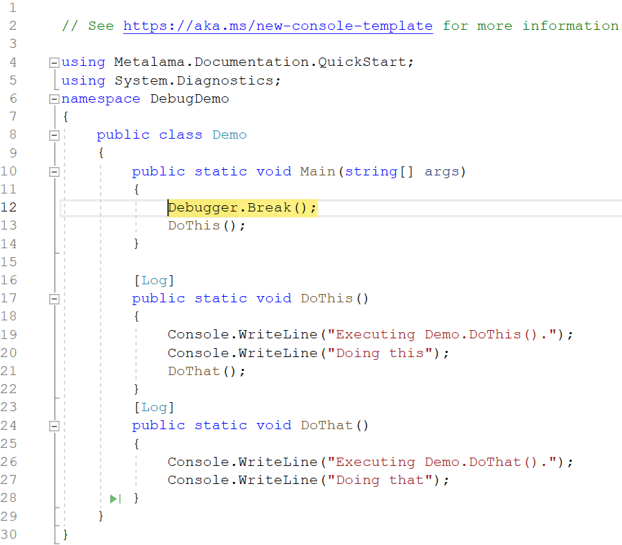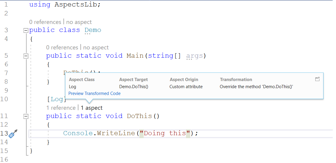 Note that the line Console.WriteLine("Running Demo.DoThis()") is generated by the Logging aspect in the AspectLib namespace.