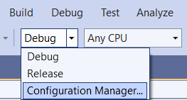 From the debug setting dropdown, select Configuration Manager: