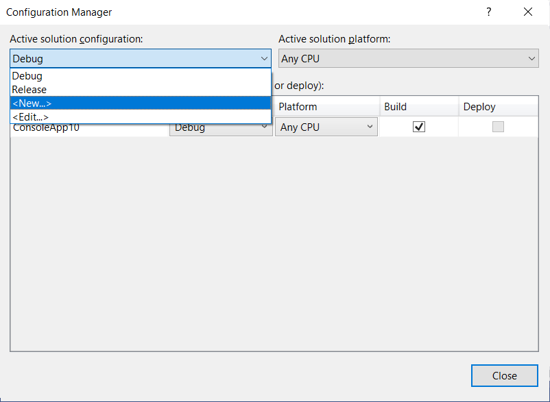 Active solution configurationdropdown.
