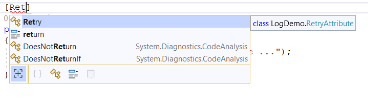 To apply the Retry aspect, add it as a standard custom attribute by typing [Retry]: