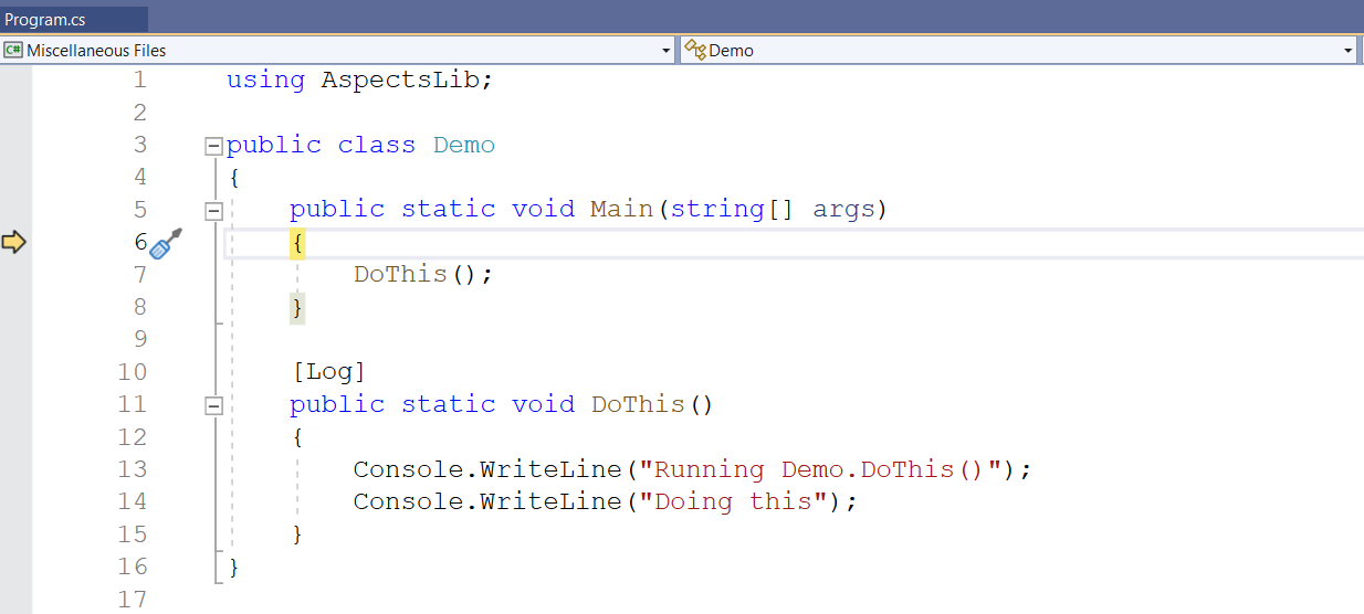 Note that the line Console.WriteLine("Running Demo.DoThis()") is generated by the Logging aspect in the AspectLib namespace.