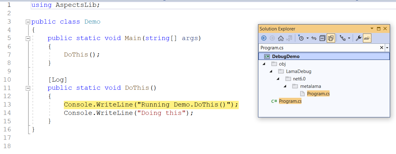Once all files in your solution explorer are displayed, locate the file under LamaDebug\net9.0\metalama.